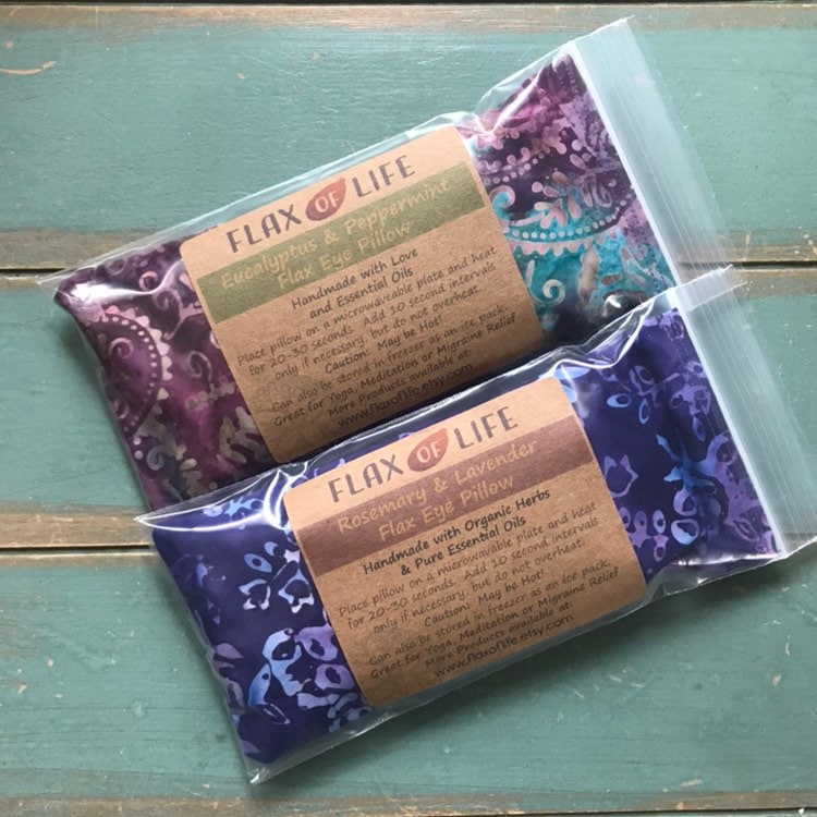 Each eye pillow is double stitched, and filled with a unique mix of flaxseed and organically homegrown herbs &/or essential oils. It has a subtle fragrance for the ultimate relaxation experience. The eye pillow measures 3.5" x 8" and is just the right size to provide the perfect combination of weight, heat and scent. Great for yoga, meditation, or relaxation. At this price, they are also great for retail in gift shops, yoga studios, nail salons, and more. The pillow can be heated to use as a hot pack, or stored in the freezer for an ice pack. Works great for sun burn relief. Each pillow comes in a reusable ziploc bag with directions attached.