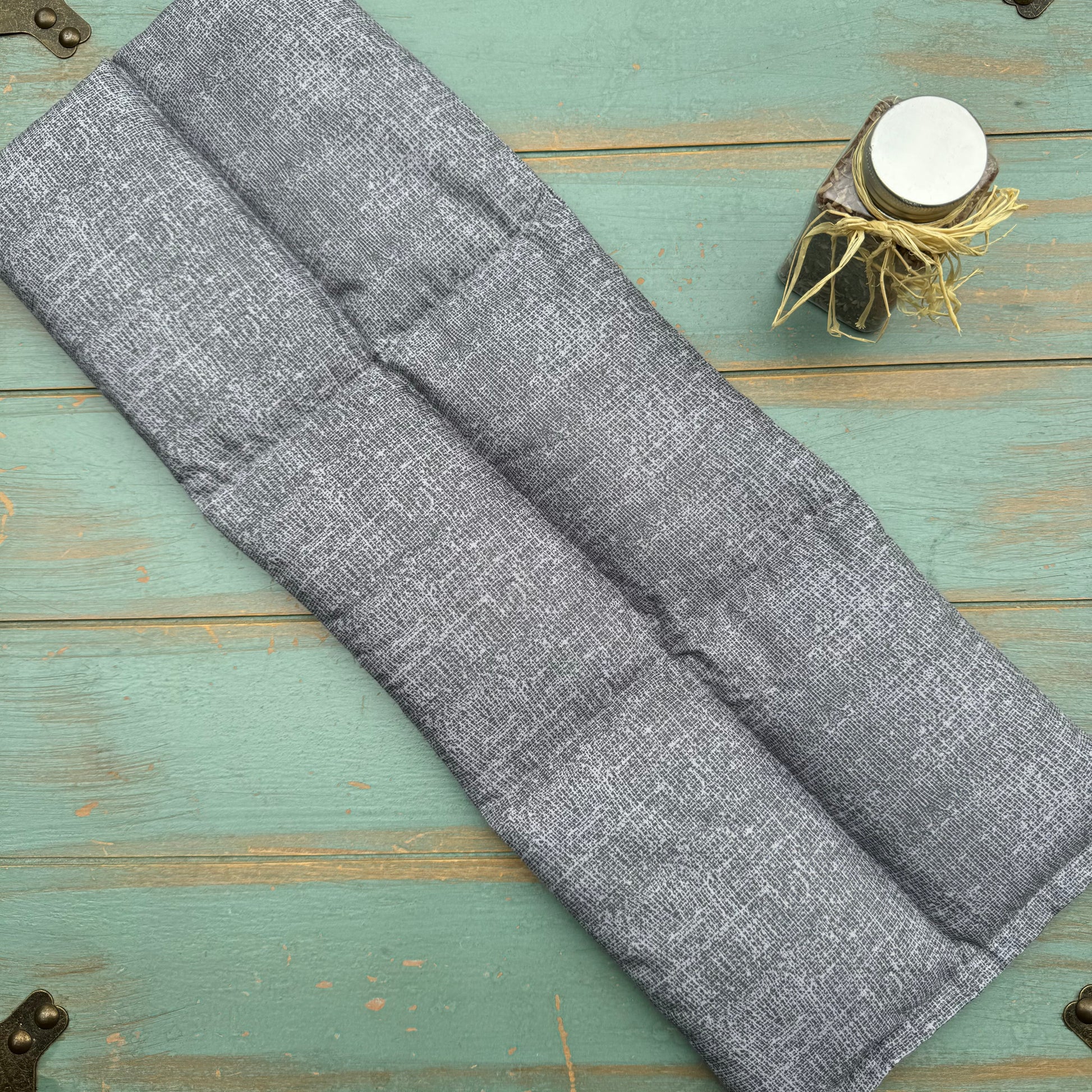 This wrap measures 8”x21”. It is filled with over 2.5 pounds of foodgrade flaxseed and lays nicely on the shoulders, abdomen or lower back and helps relieve neck, shoulder pain or lumbar pain. It can also alleviate migraines, menstrual cramps, knee pain, hip pain, or even great for use as a lap warmer or bed warmer. Possibilities are endless, and it is a thoughtful gift for someone recovering from an accident or a recent knee, hip, or shoulder replacement.