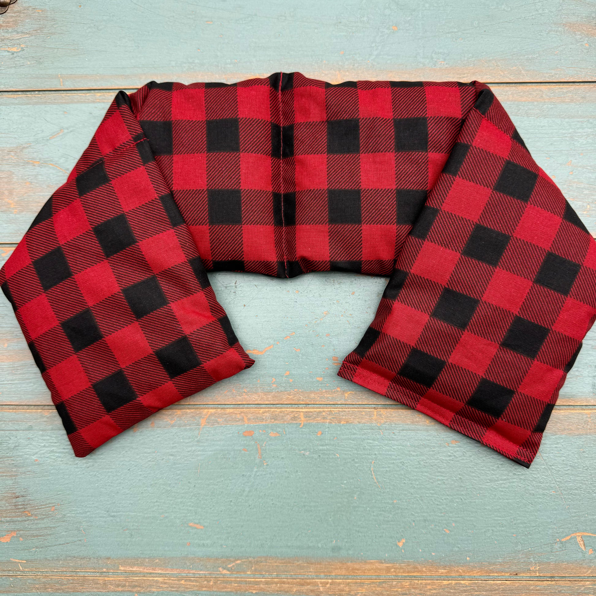 Neck Wraps are 21”x4” and weigh roughly 1.5 pounds. Each neck wrap is divided into three sections to keep flax from shifting.