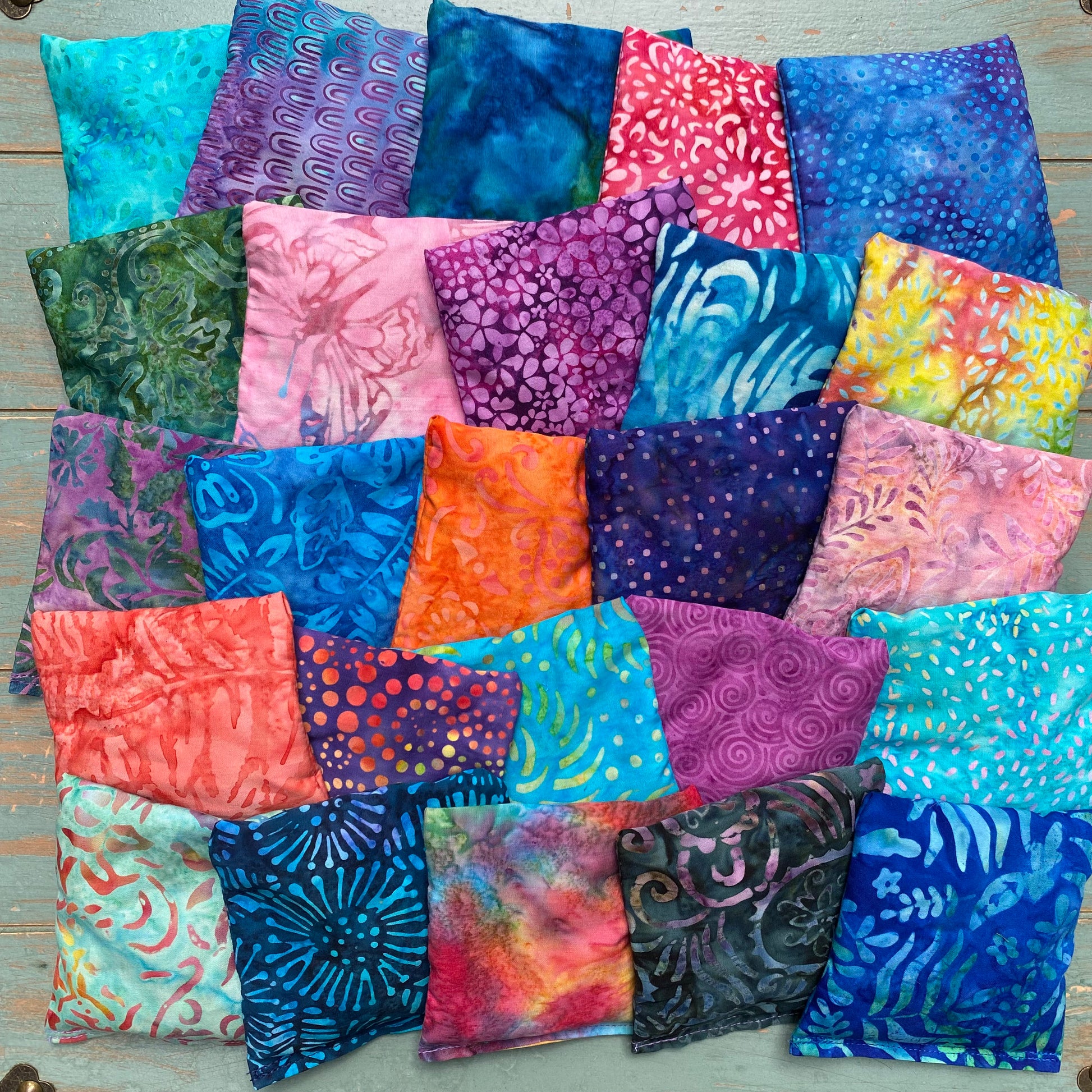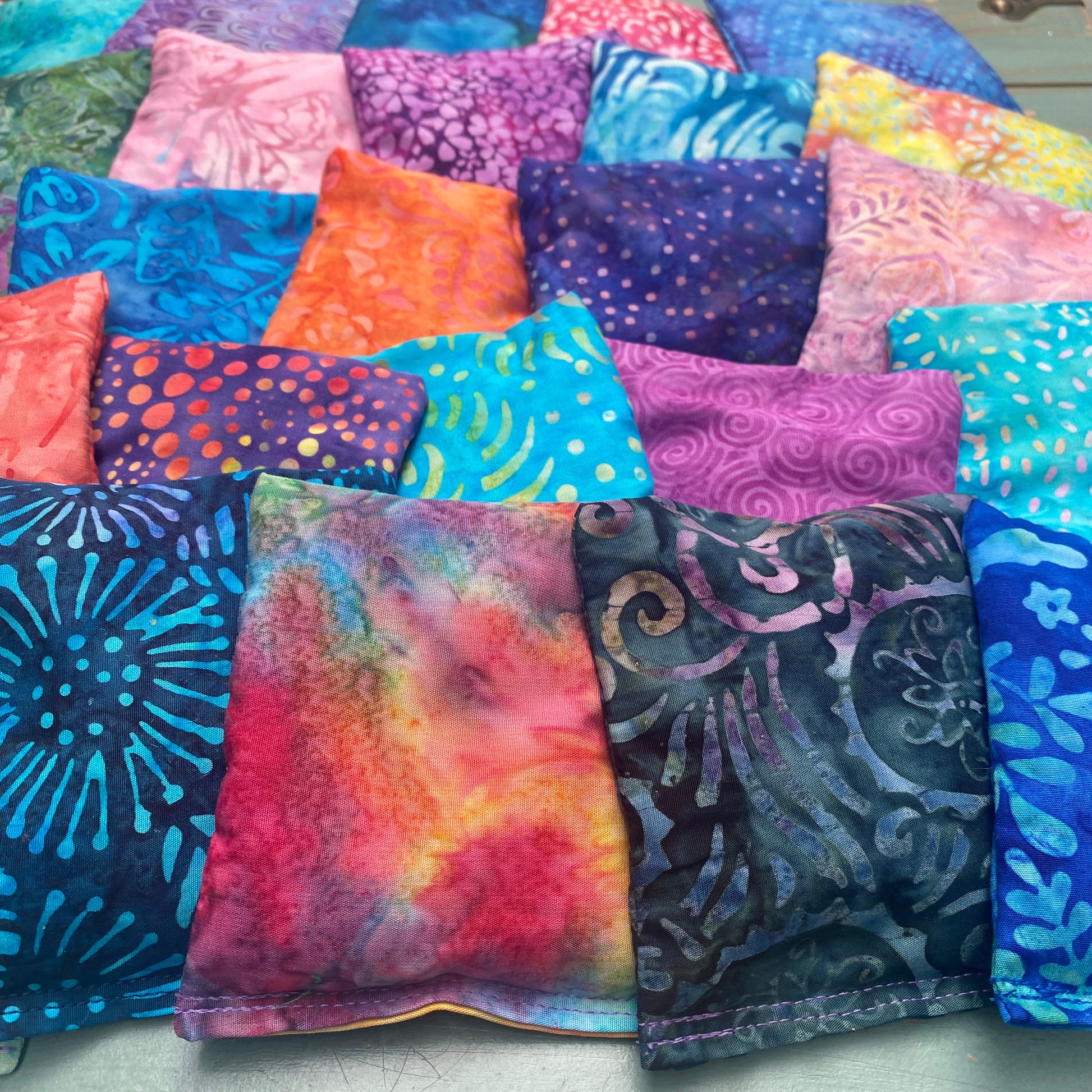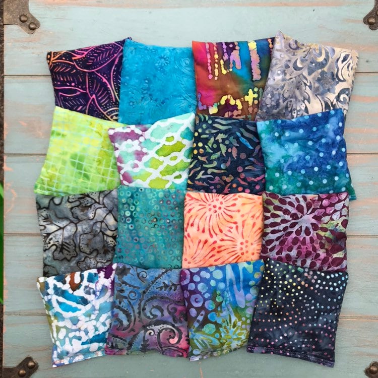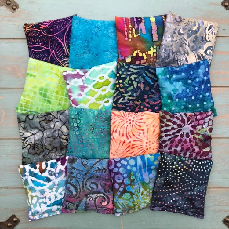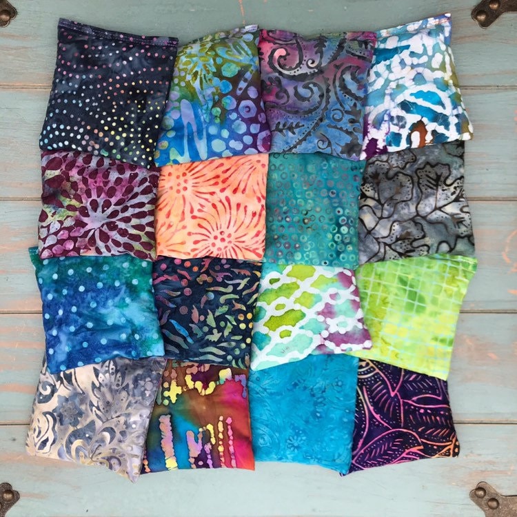 Aromatherapy ShaShas are offered in sets of 6, 12, 18, 24 and 30, making them the perfect yoga studio or classroom addition. Fabrics will be a various mix of colorful hand-dyed batiks as shown.