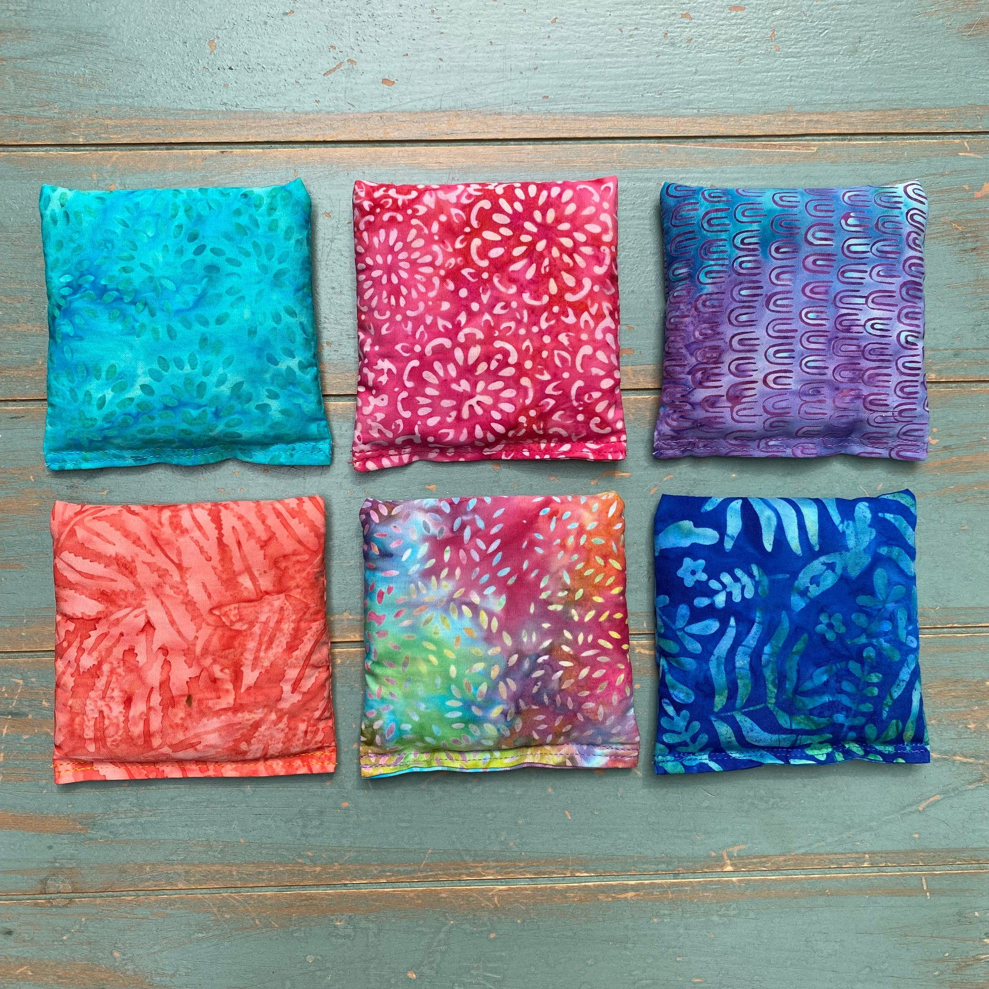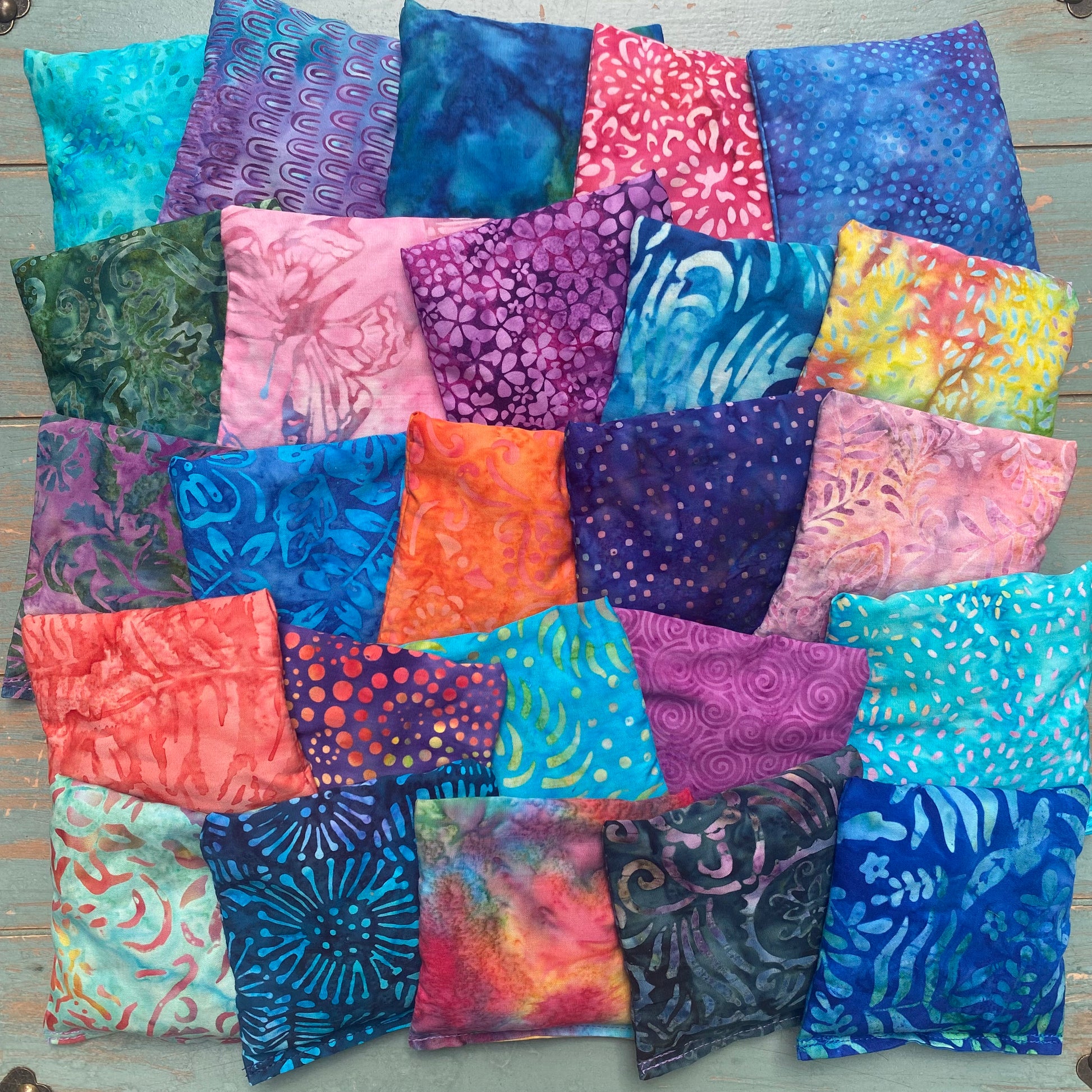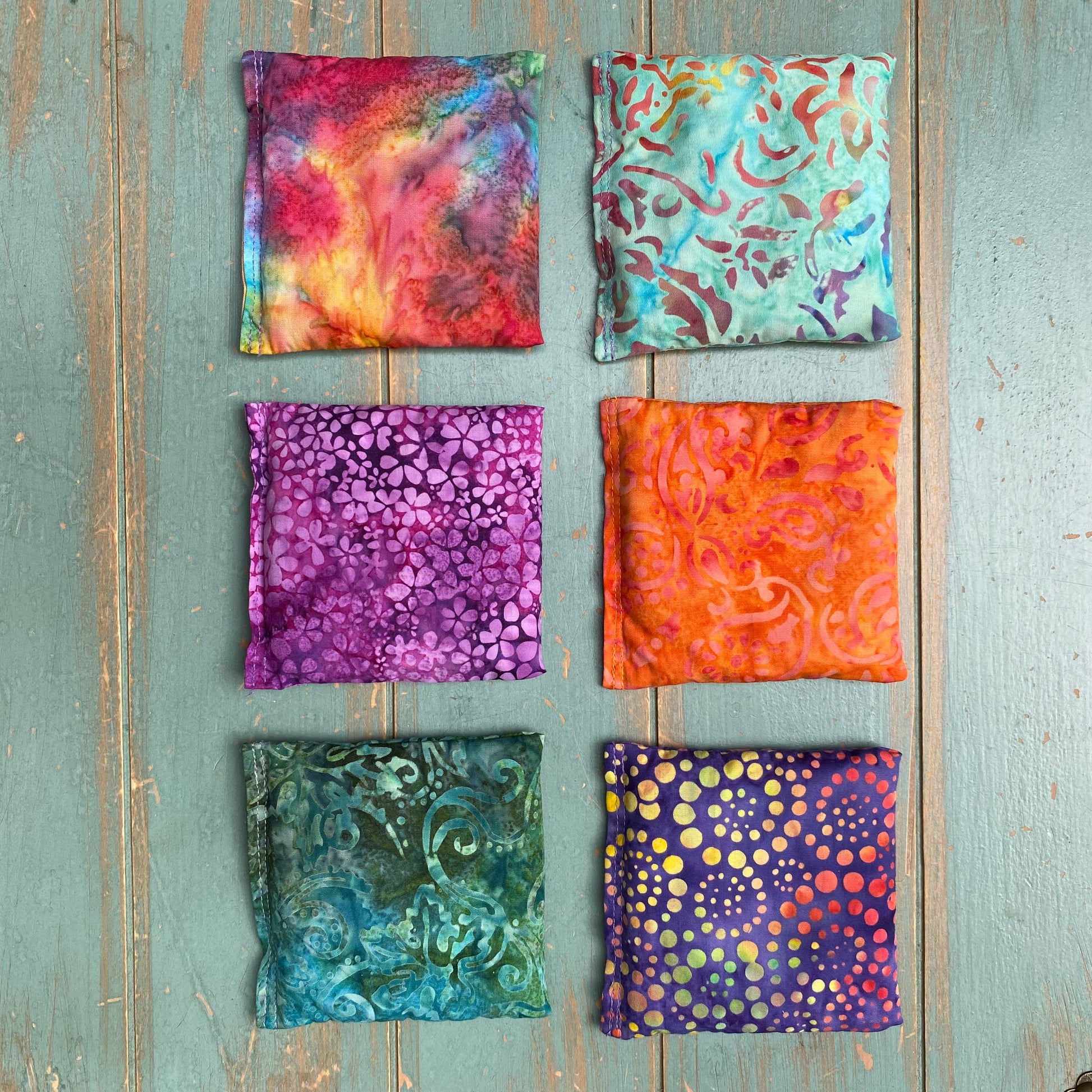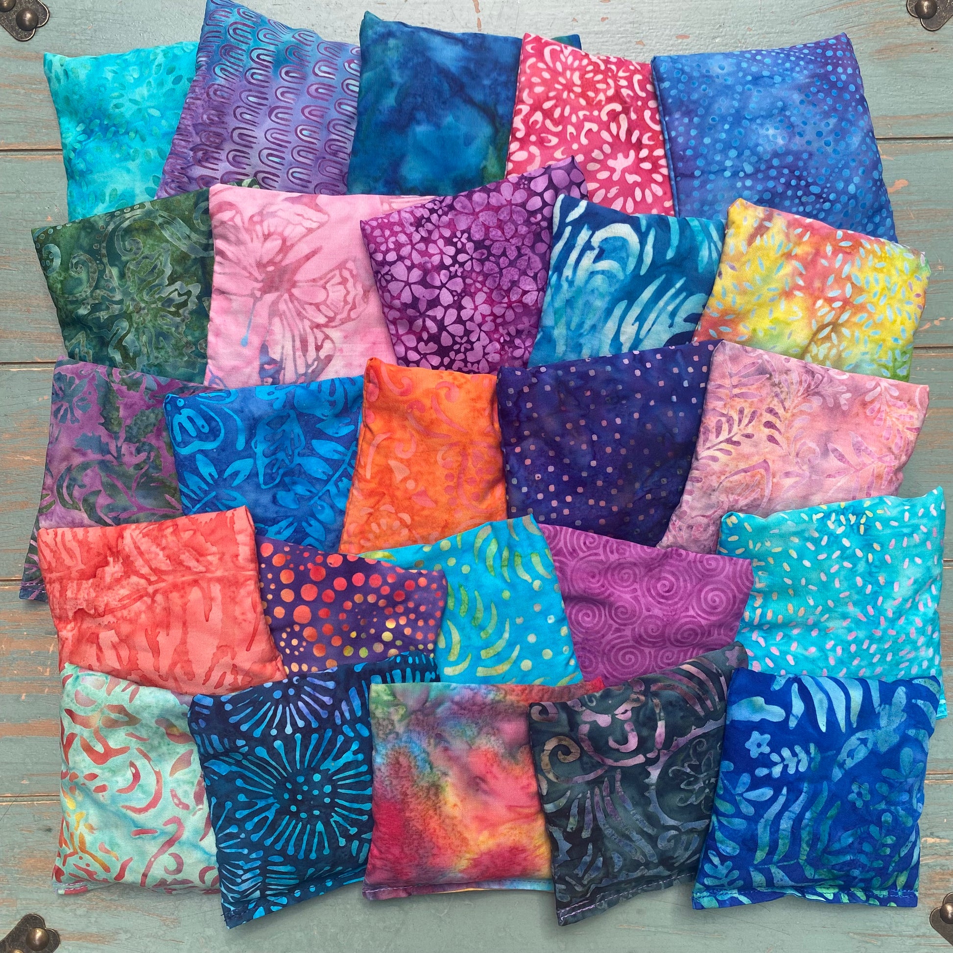 Aromatherapy ShaShas are offered in sets of 6, 12, 18, 24 and 30, making them the perfect yoga studio or classroom addition. Fabrics will be a various mix of colorful hand-dyed batiks as shown.