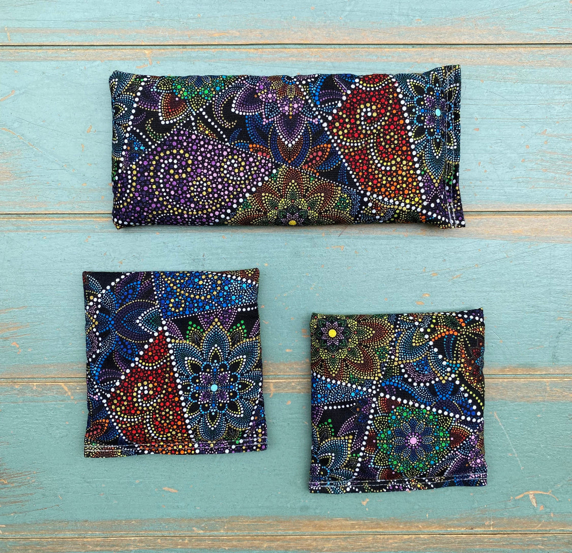 Take your Savasana to the next level! Introducing new hand ShaSha's to help keep you grounded at the end of your practice. This gift set includes one aromatherapy flaxseed eye pillow and 2 lightweight flaxseed hand squares in your choice of Rosemary Lavender, Eucalyptus Peppermint or unscented. Each item is double stitched and filled with food grade flaxseed and organic herbs and pure essential oils.
